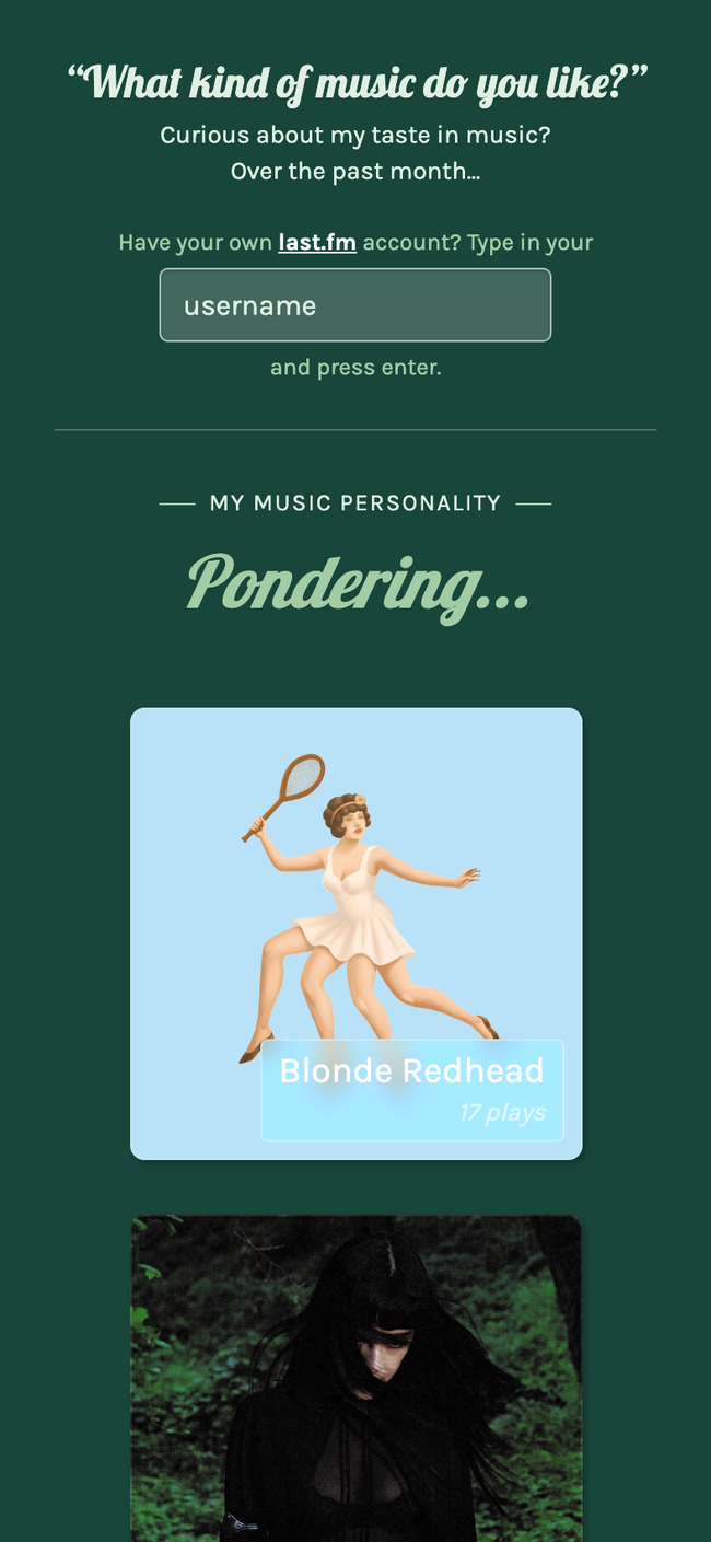 I'm often asked "What kind of music do you like?" — a question I can never fully answer. So I built a tool that dynamically presents my recent listening history in a visual format.