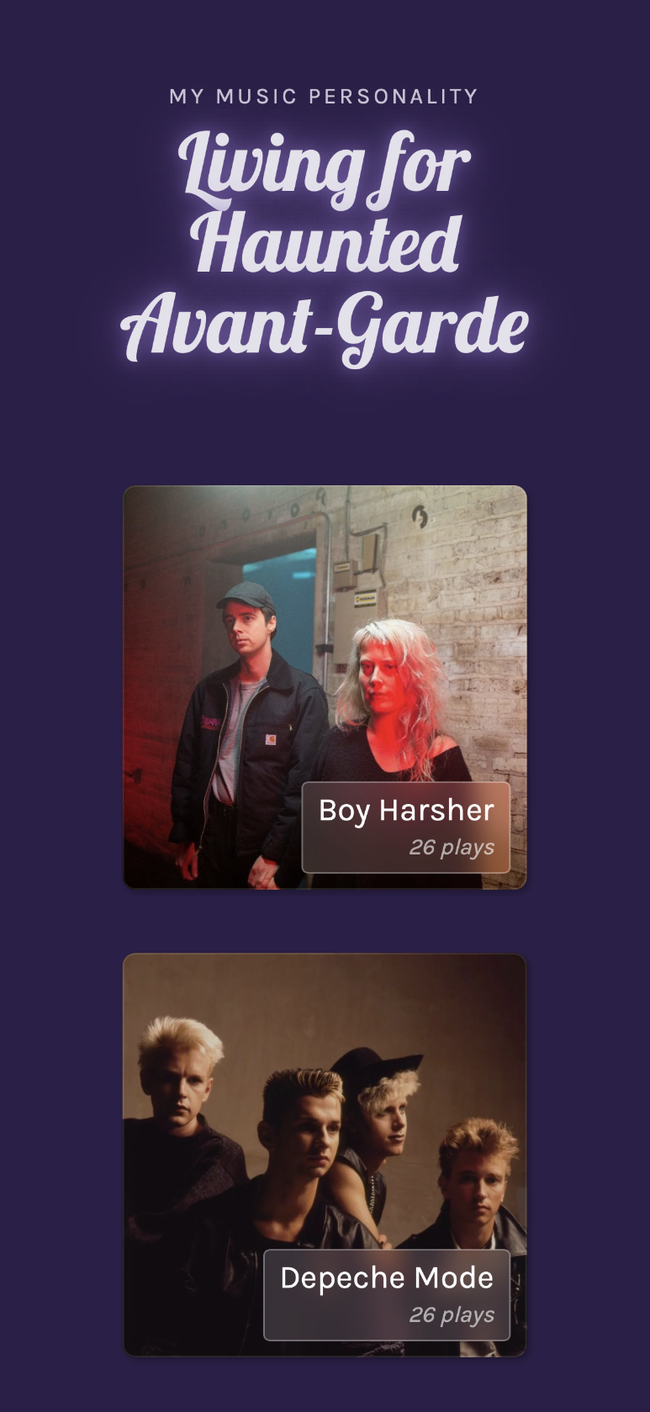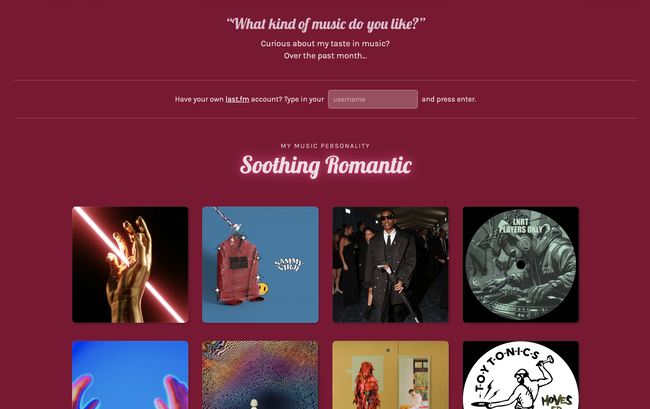I am asked “What kind of music do you like?” all too often. It's the kind of question I can never answer to a satisfactory extent, so I decided to create a solution by aesthetically and dynamically presenting my recent music listening history.